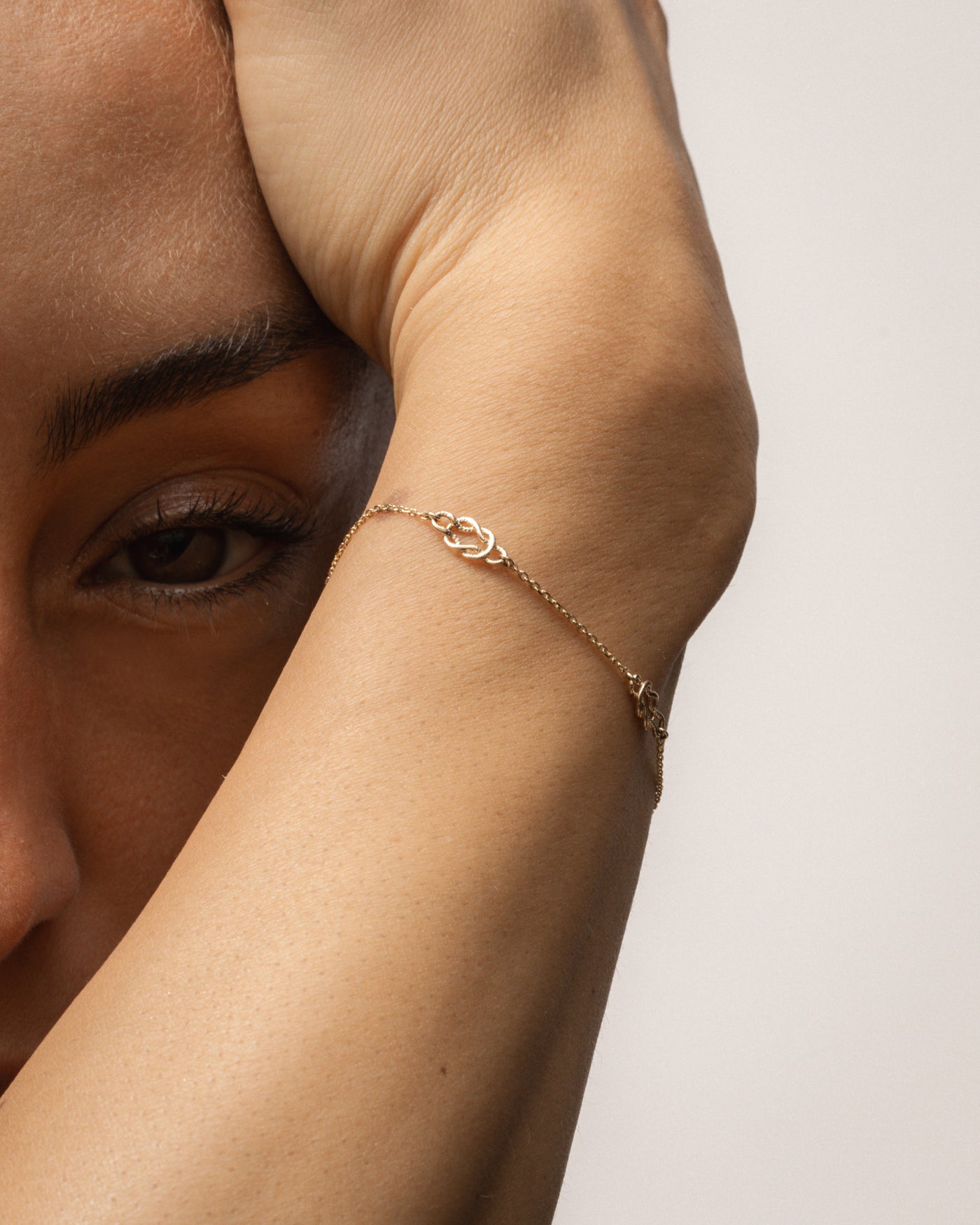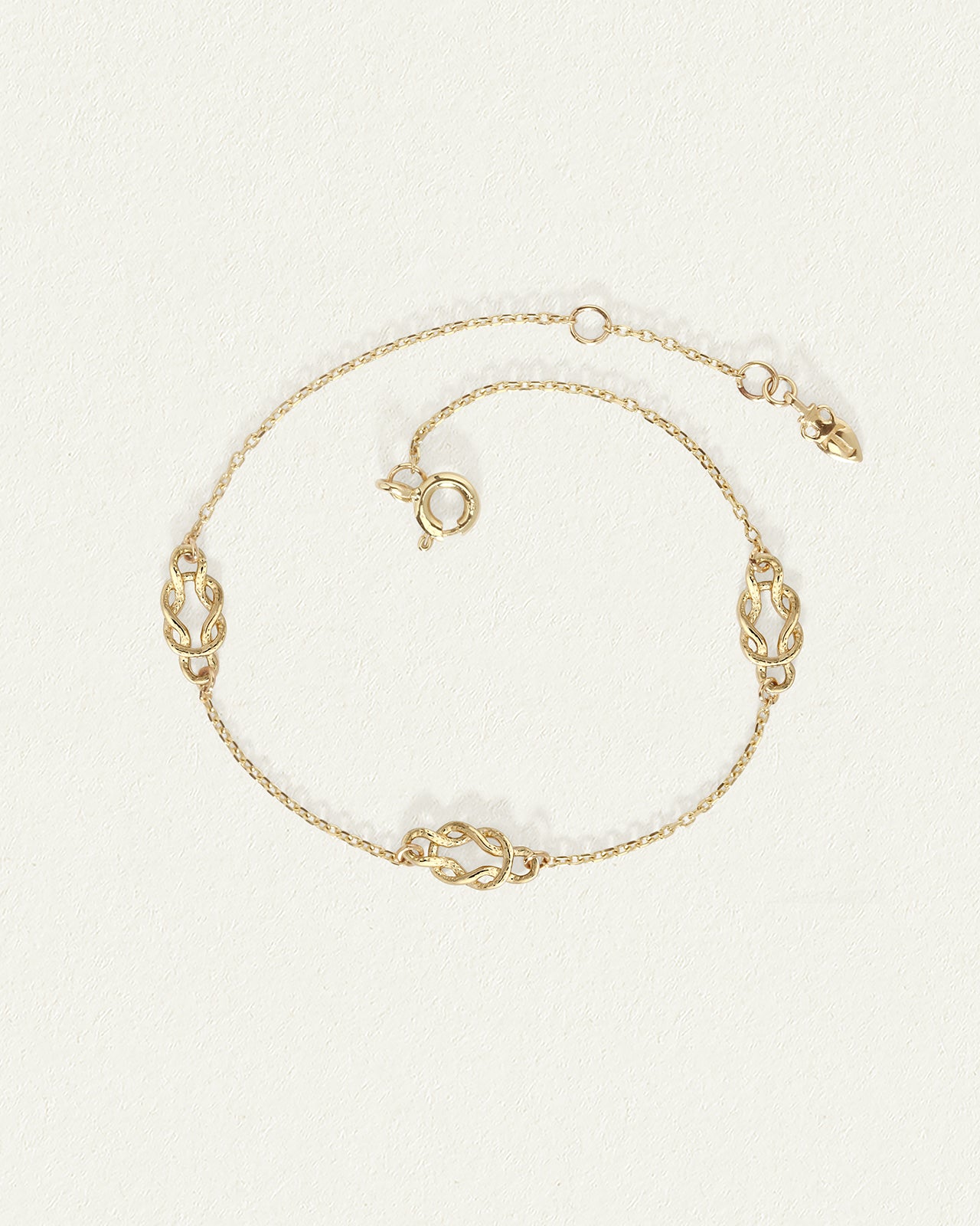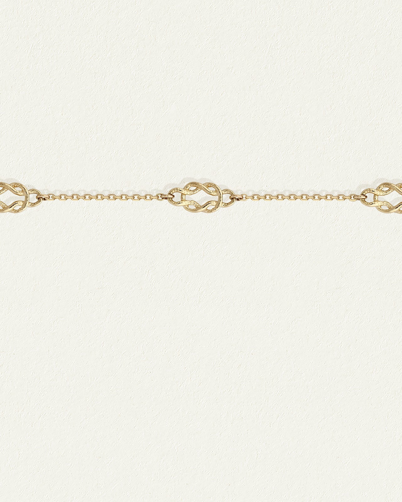 The solid gold Airla Bracelet features delicate love knots evenly spaced along a fine cable chain. Rooted in ancient tradition, Herakles knots symbolise eternal love and unbreakable bonds.