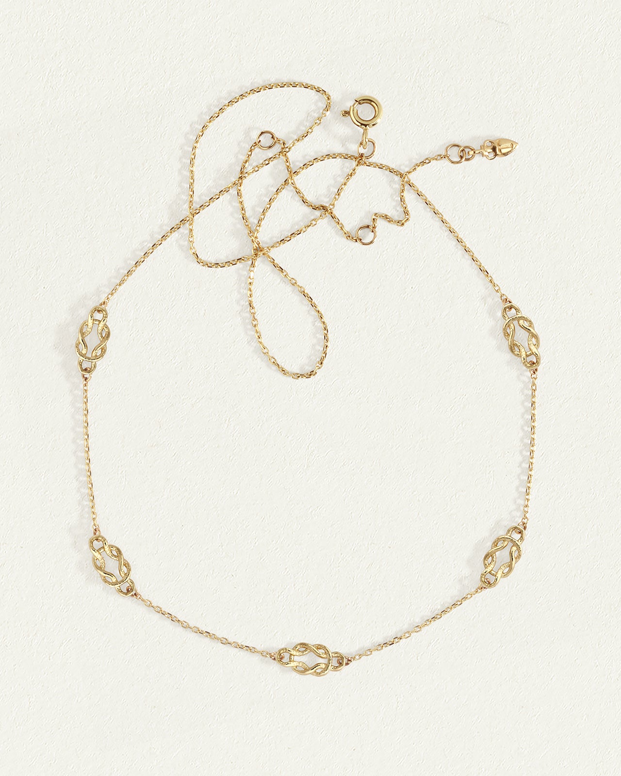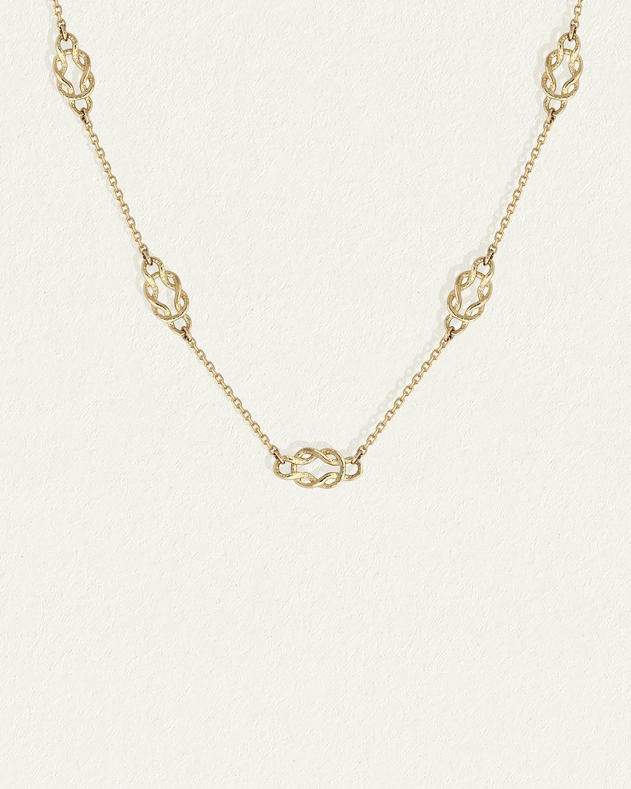 The Airla Necklace is a solid gold station necklace featuring delicate love knots evenly spaced along a fine cable chain. Rooted in ancient tradition, Herakles knots symbolise eternal love and unbreakable bonds.