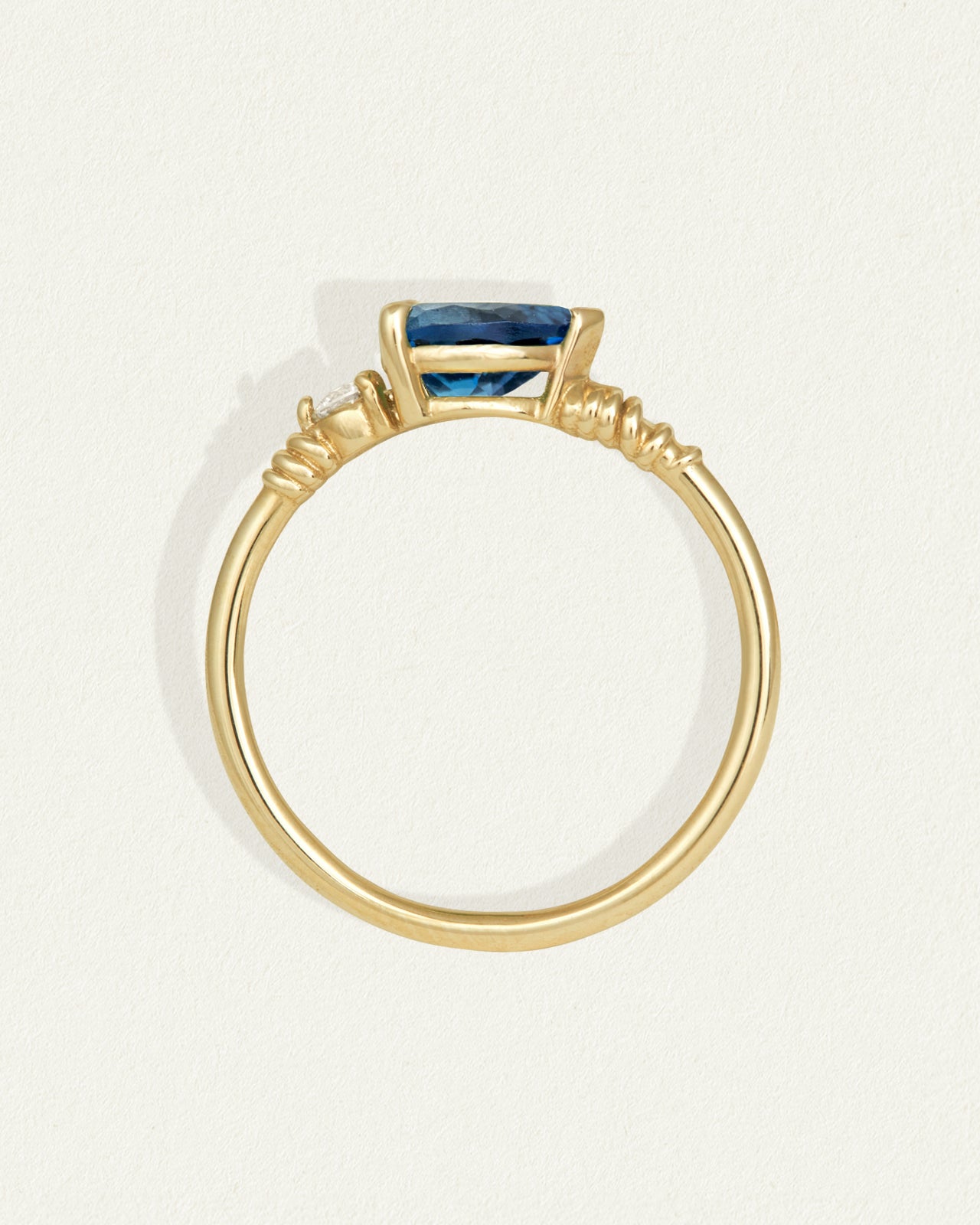 Golden filaments, akin to the rejuvenating growth of spring, coil gracefully around the fine yellow-gold band of the Ariel Ring. A symbol of harmonious union, this teal toi et moi ring showcases an enchanting London blue topaz pear complemented by a round brilliant-cut lab diamond.