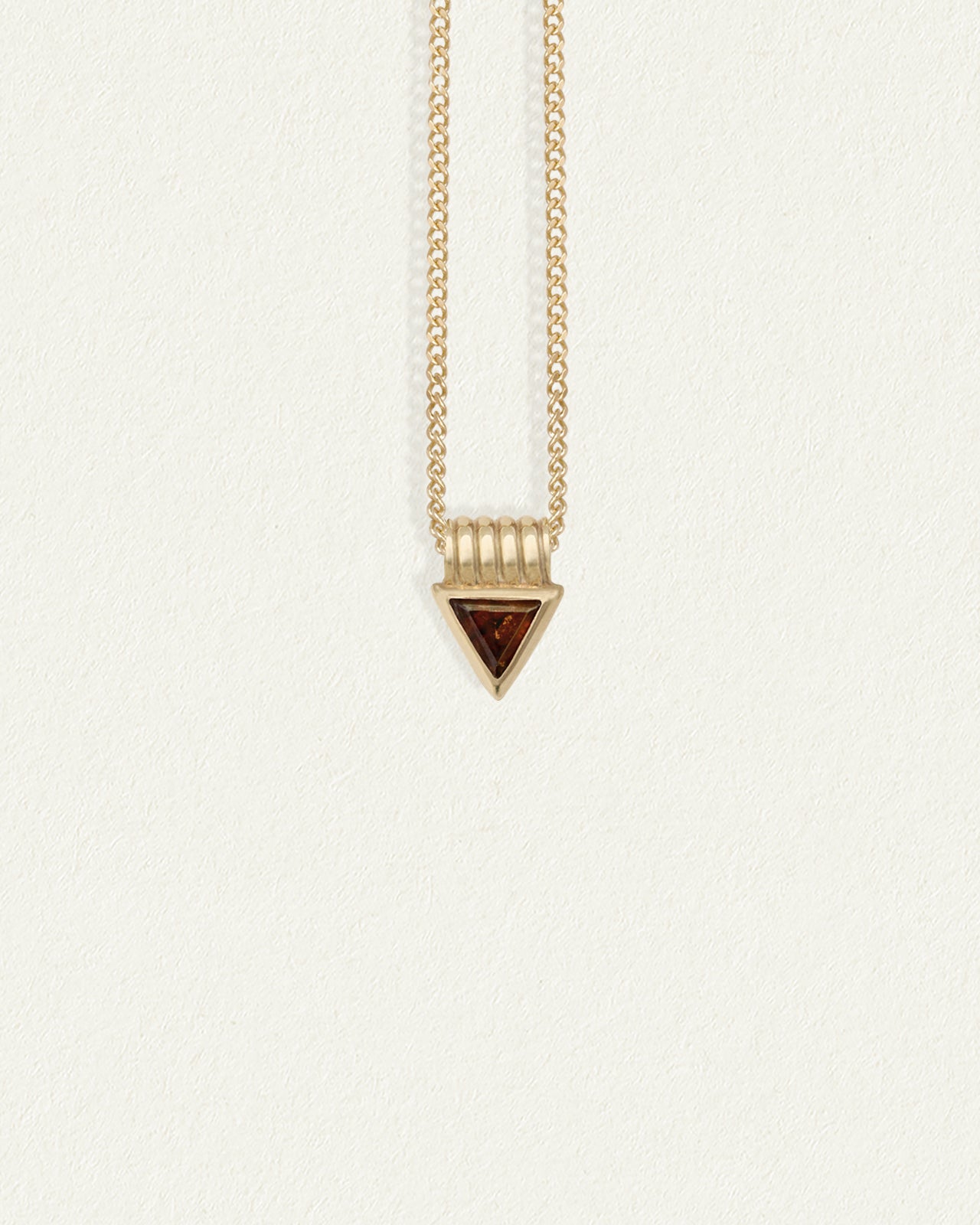 The Chalice Necklace Garnet is a delicate and minimalist design featuring a trillion-cut Garnet pendant, suspended from a fine curb chain. The upside-down triangle traditionally referred to as the 'chalice' represents femininity and water.