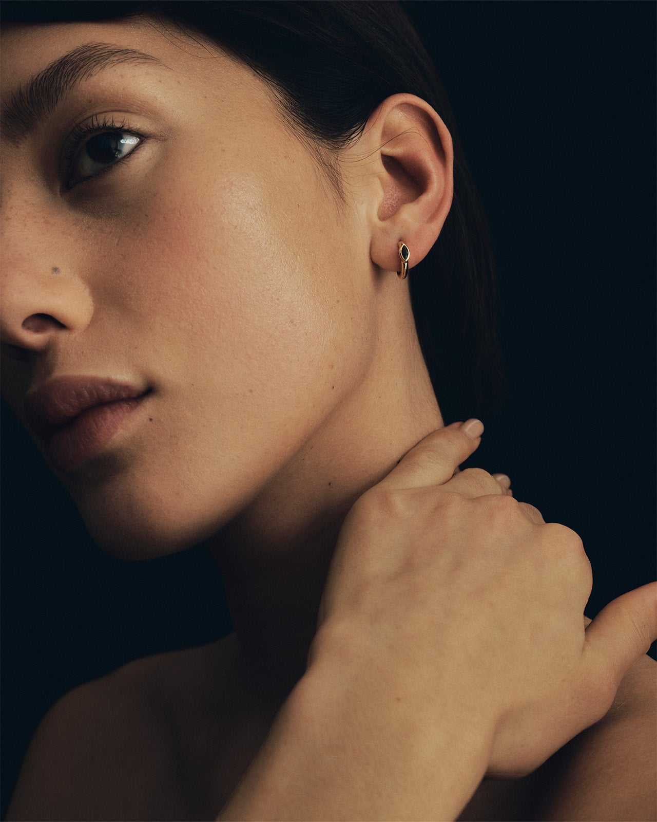 The Chrysalis Earrings in 18K Gold Vermeil are a classic gold small hoop with Eye motif in Blue Sapphire. Both the Eye symbol and Sapphire represent wisdom and knowledge, imparting insight and protection upon the wearer.