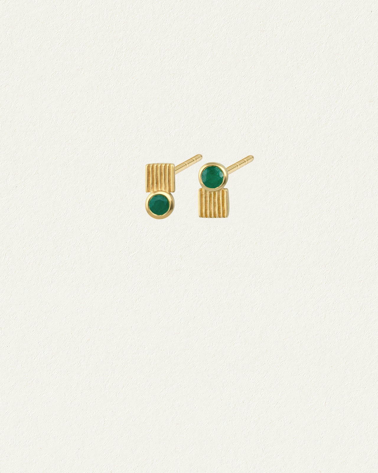The Cindi Studs, in 18k gold vermeil, are a playful tribute to ancient grandeur. Inspired by mosaics, these asymmetrical stud earrings feature vivid green onyx gemstones.