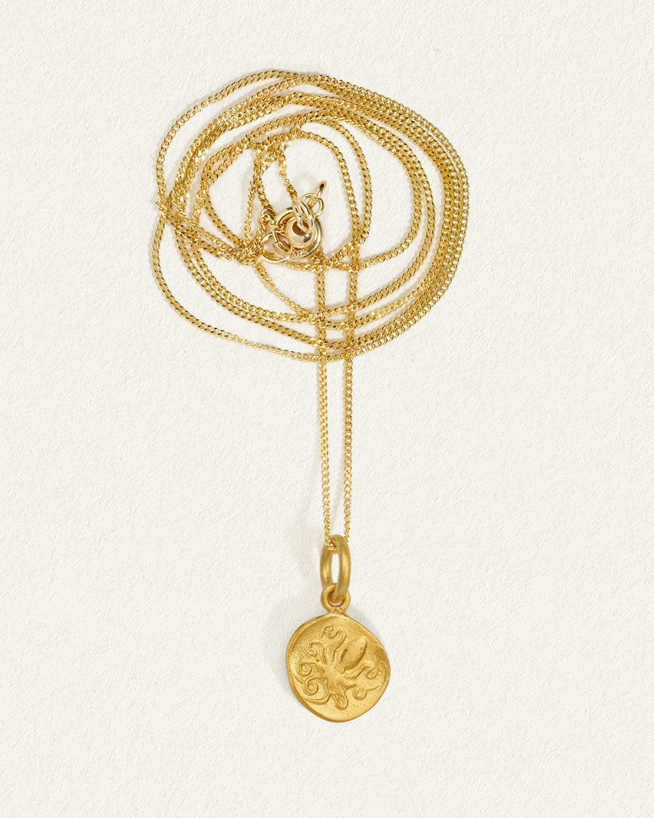 Representing renewal and adaptability, this solid gold coin necklace bears a classical profile with an octopus motif on the reverse. Suspended from a 14k curb chain, this double-sided pendant is made from pure 24k gold offering a rich, tactile lustre that is eternally timeless.
