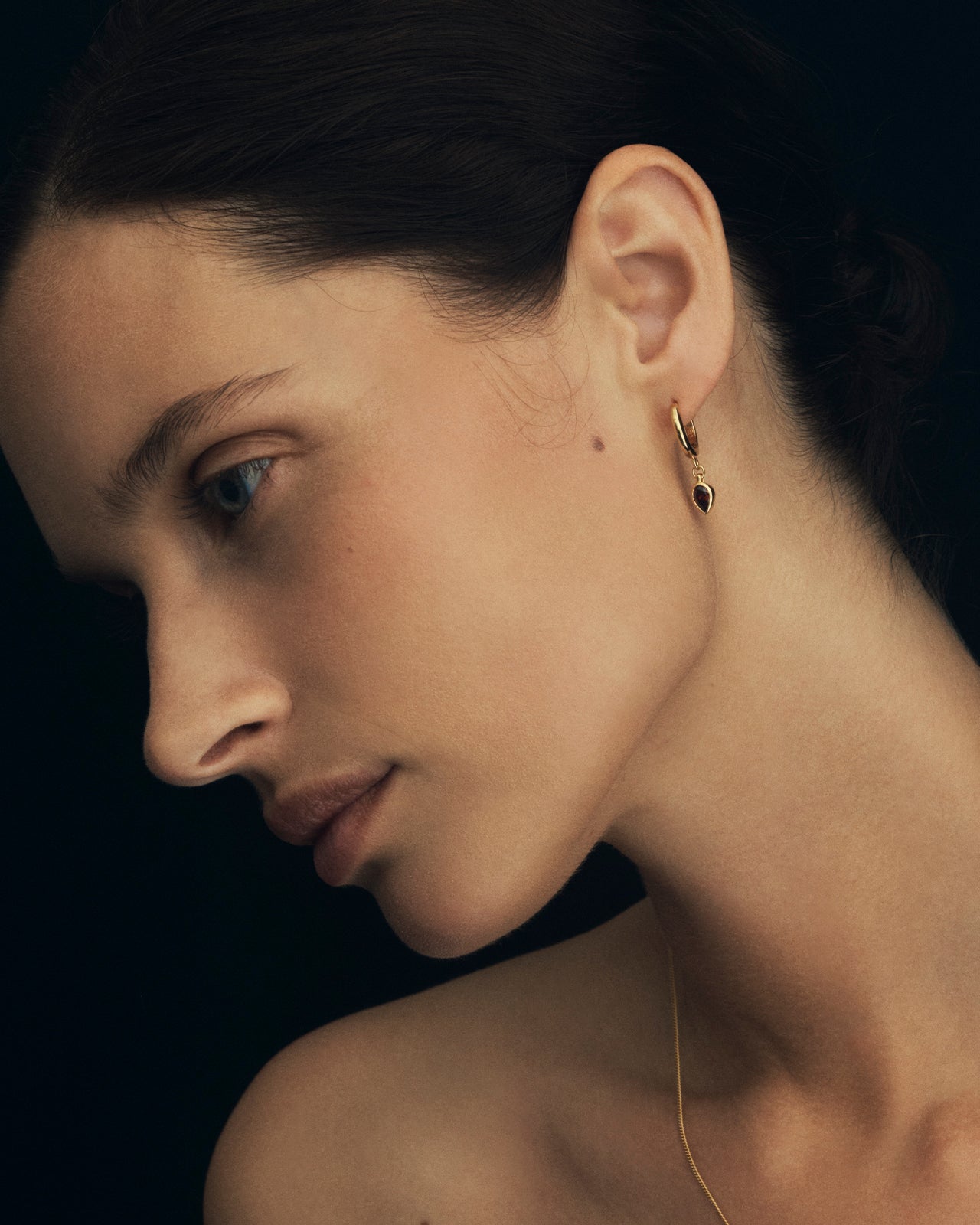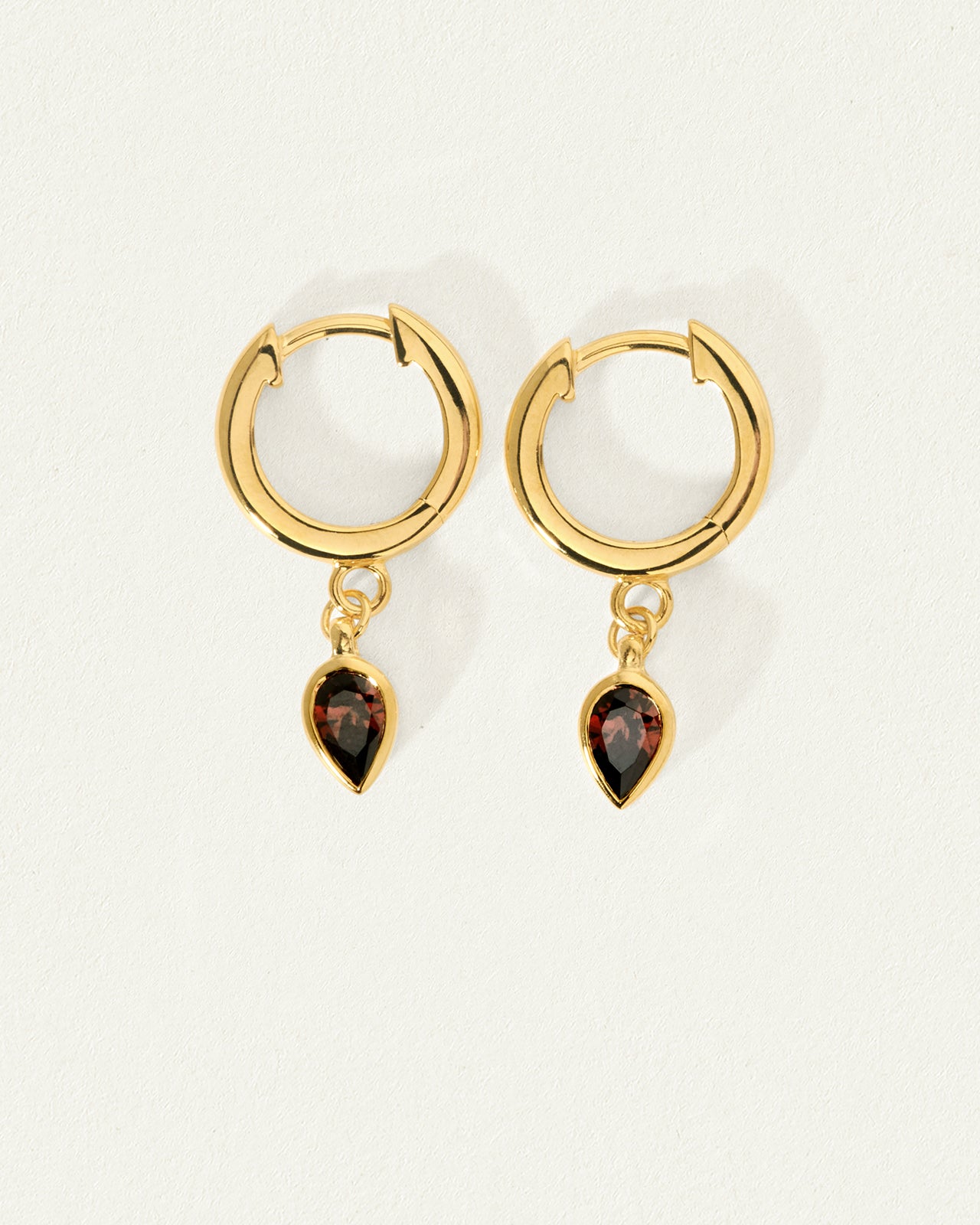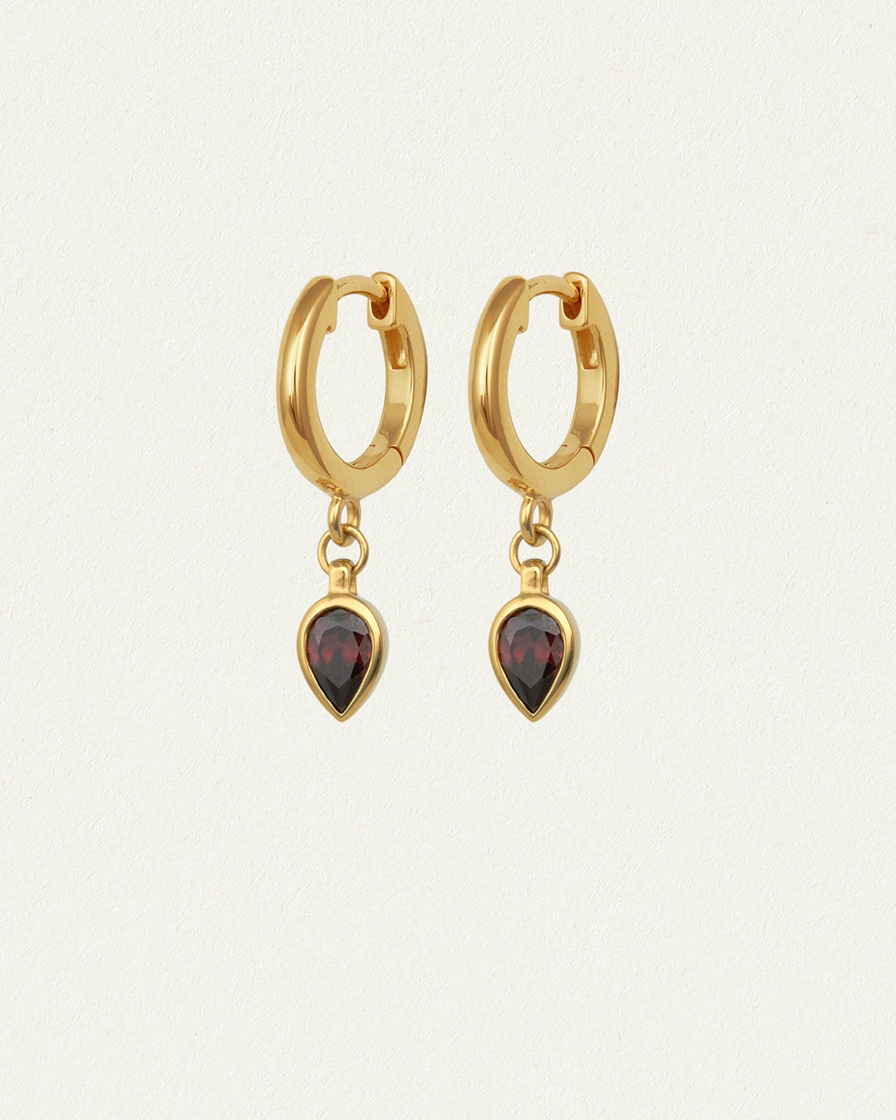 The Flame Earrings cast a warm glow, each adorned with a pear-cut garnet, reminiscent of a flickering flame. Set in 18k gold vermeil and clasped with a huggie closure, these drop earrings offer an ideal silhouette to enhance an ear stack with their smouldering allure.