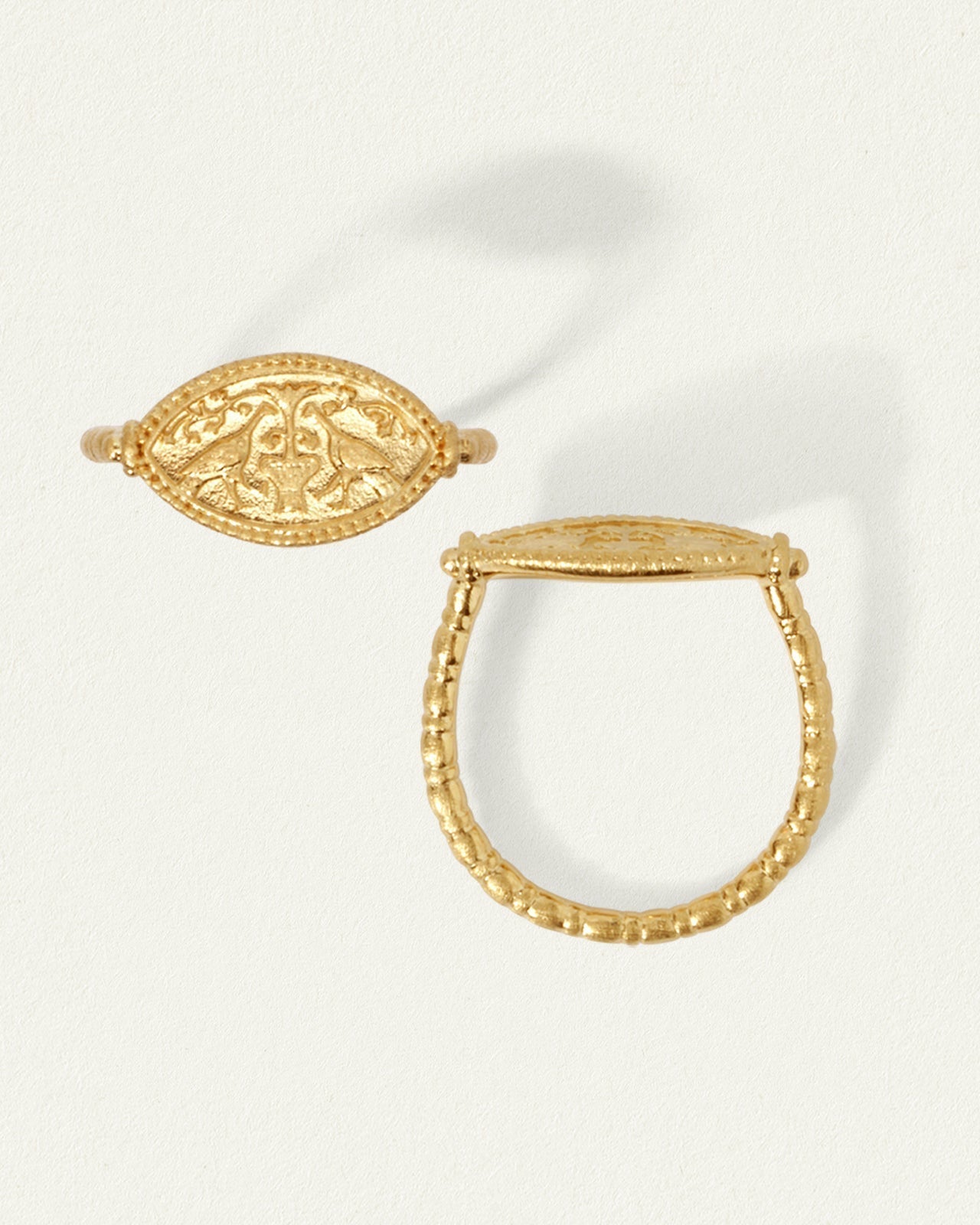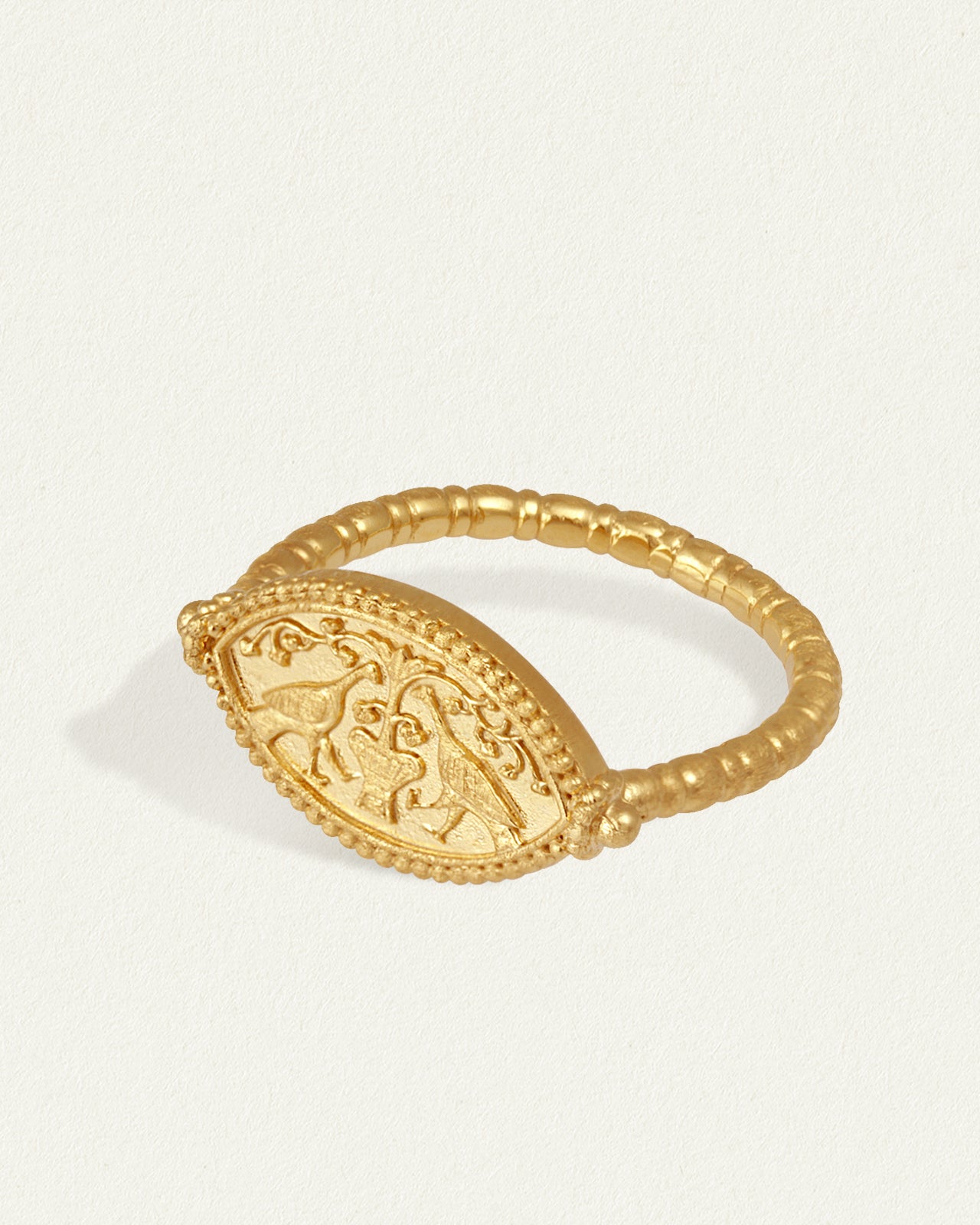 The Gaia Ring, with its cross-brushed 18k gold vermeil signet face and regal peacock motif, embodies our reverence for ancient craft. Named in honour of Gaia, the Greek goddess of the earth, this timeless seal ring is designed to nurture your divine feminine energy and growth.
