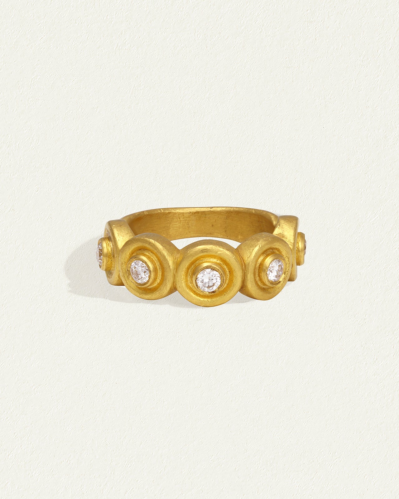 Handcrafted in Istanbul from 24k gold, the Hecuba Ring features five bezel-set natural diamonds arranged in a crown-like formation. The structured design of this diamond half-eternity ring is inspired by early Byzantine craftsmanship.