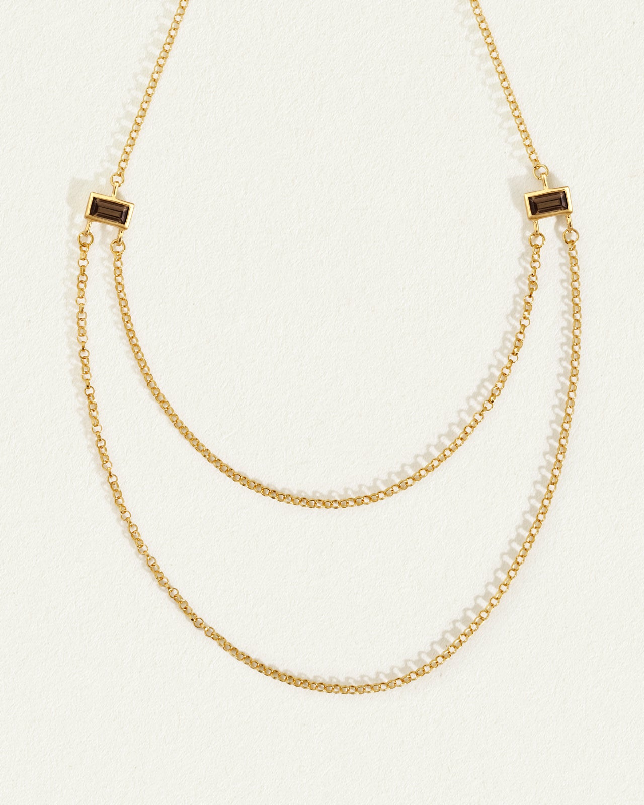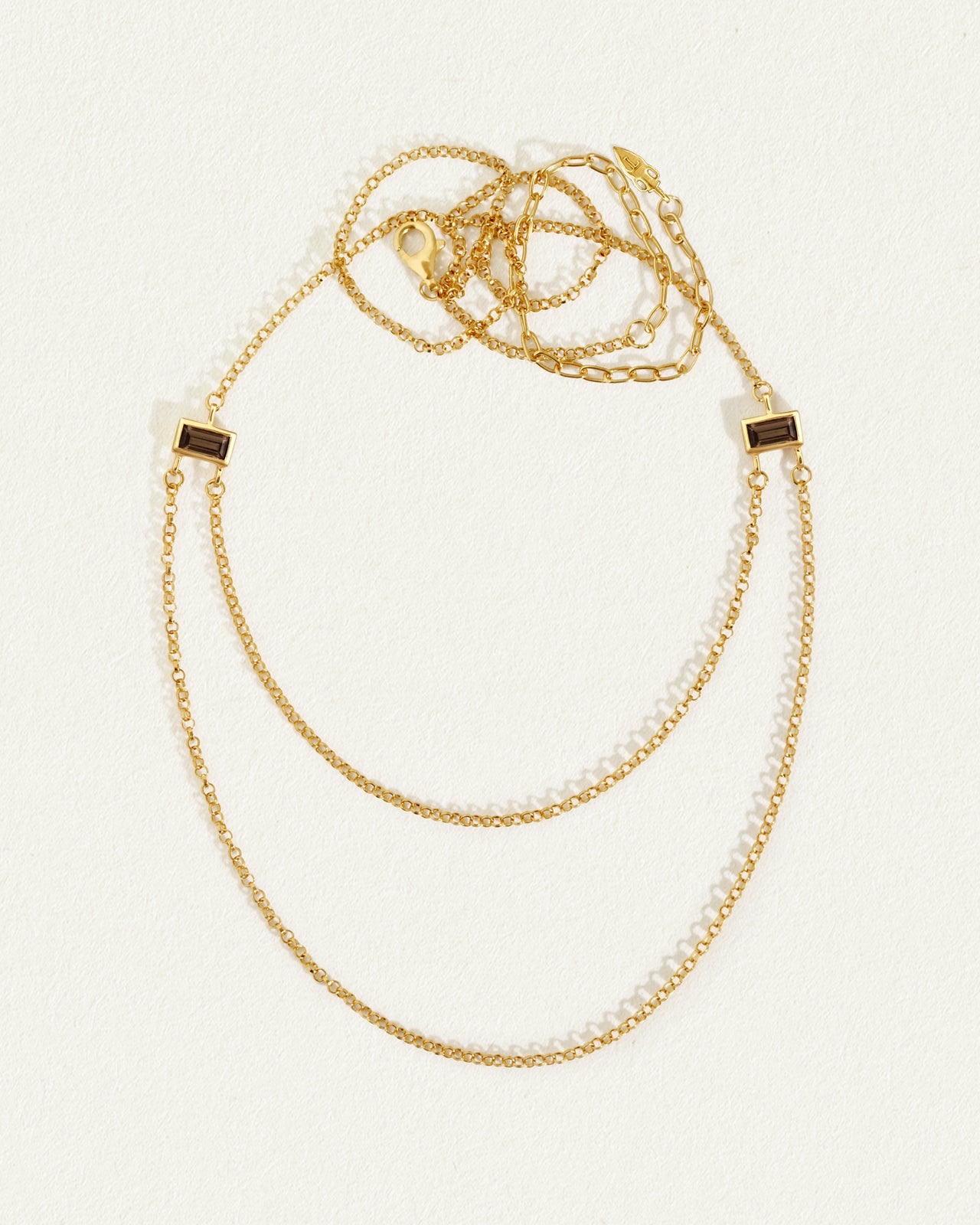 A statement necklace crafted from 18k gold vermeil, the Hermes Necklace is inspired by the divine messenger. Featuring twin rolo chains that cascade gracefully from baguette-cut smoky quartz, this layered necklace bridges realms, illuminating paths of knowledge.