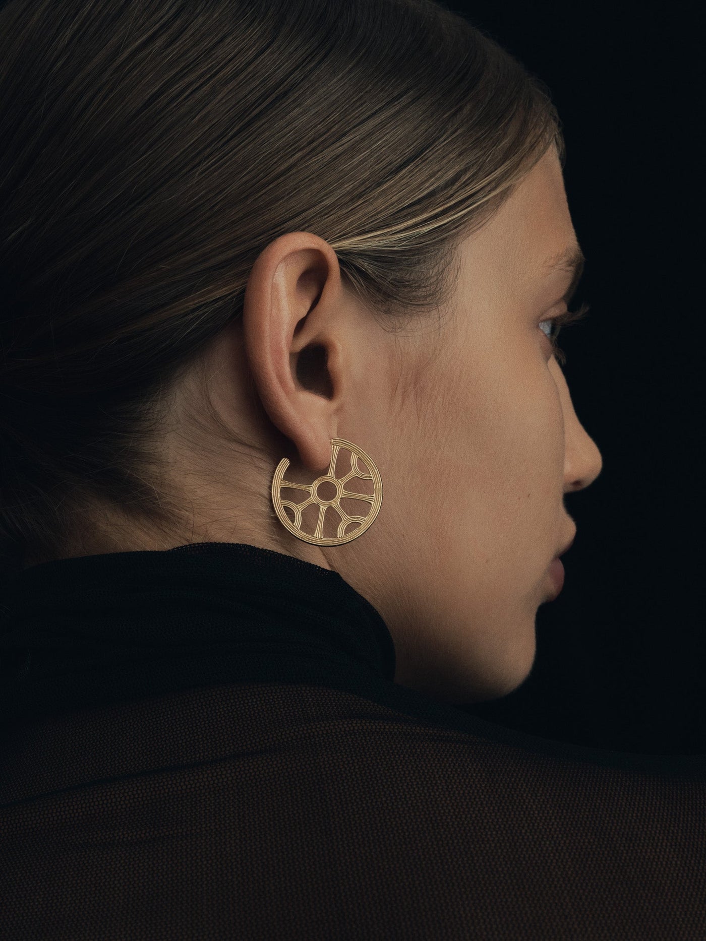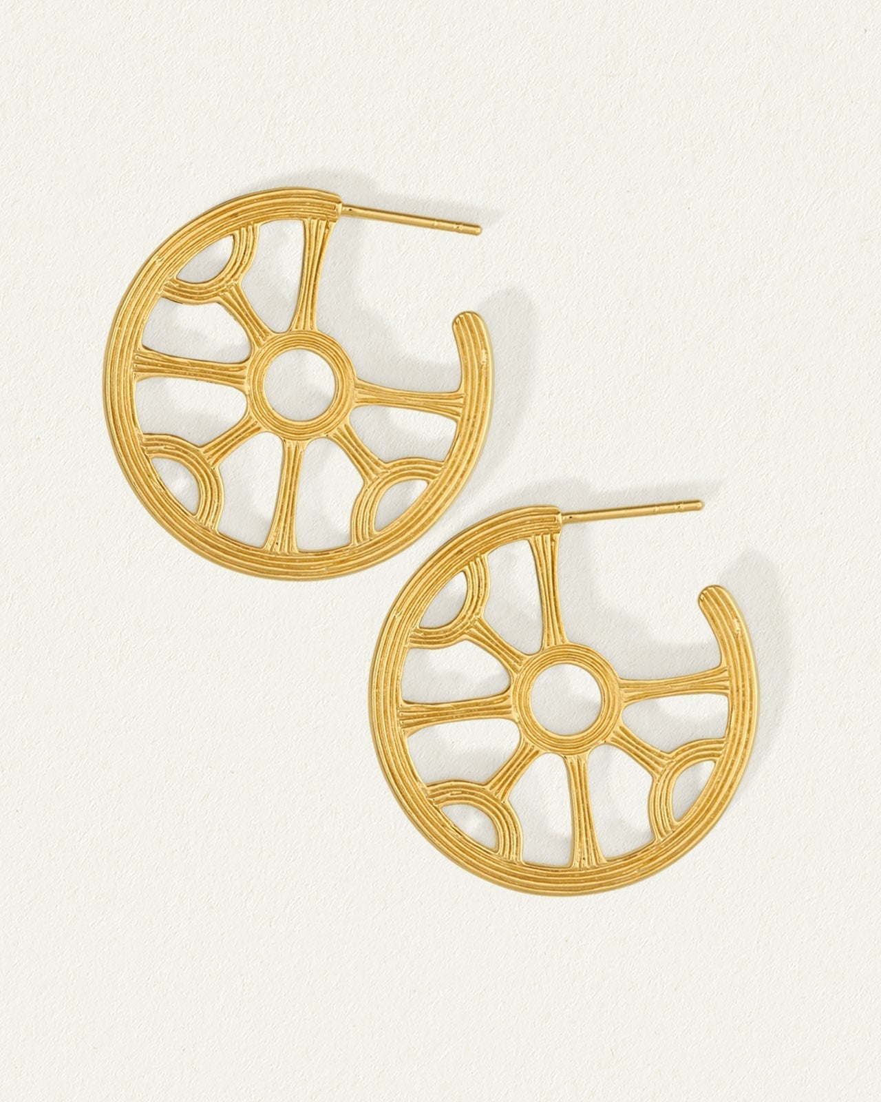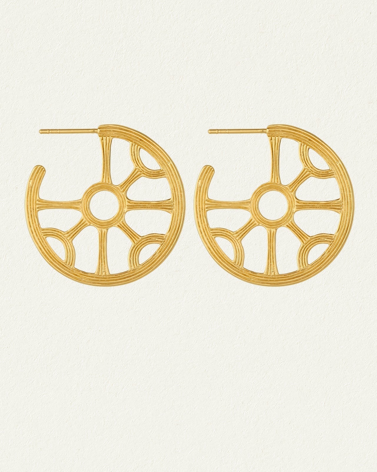 Crafted from 18k gold vermeil, these openwork hoop earrings feature radiating spokes converging at a central ring. This design draws inspiration from ancient cultures, referencing solar motifs found in Greco-Roman art.