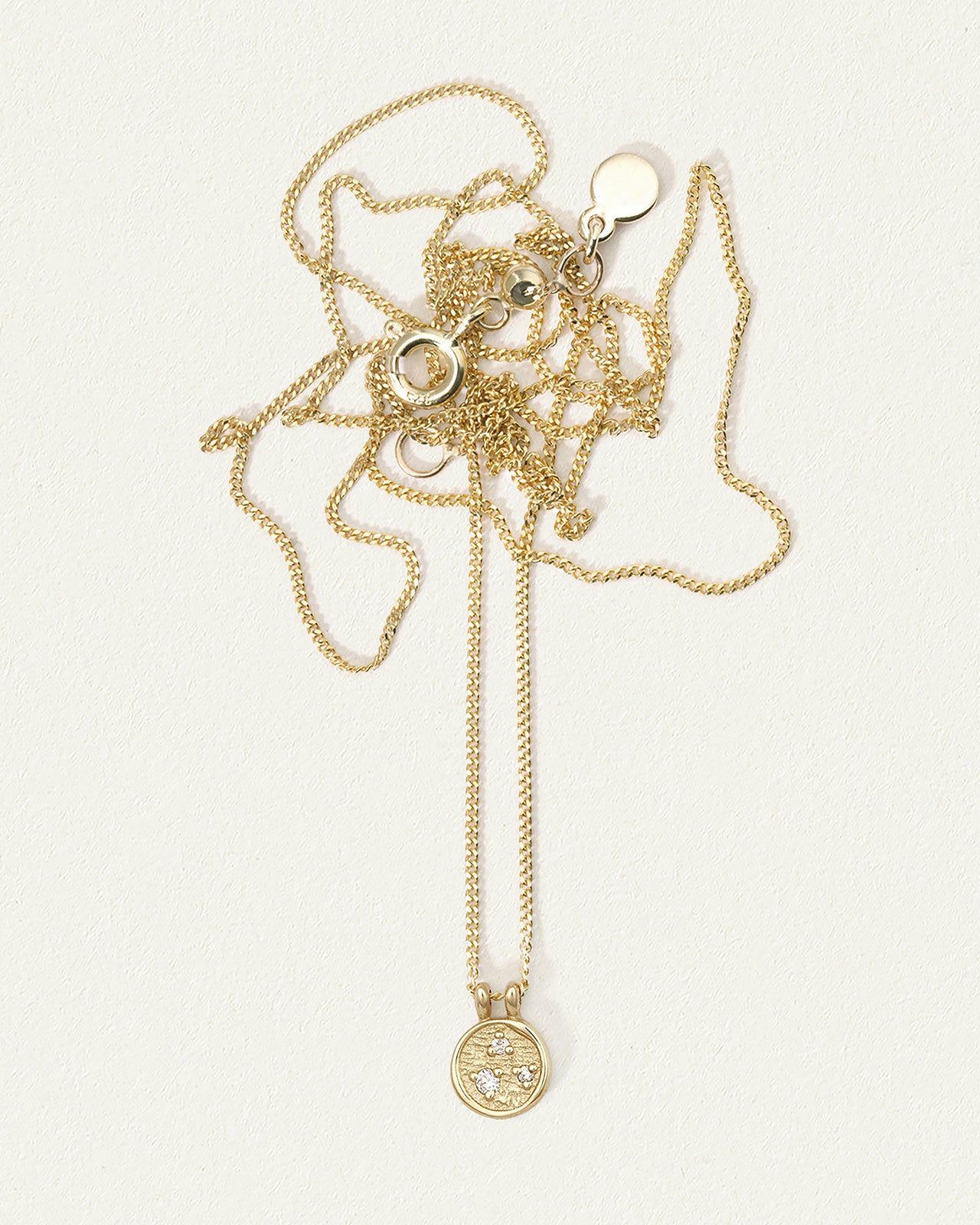 Embrace the ethereal allure of the Kasia Coin Necklace. Suspended on a fine curb chain, this textured coin pendant is adorned with a radiant constellation of diamonds.