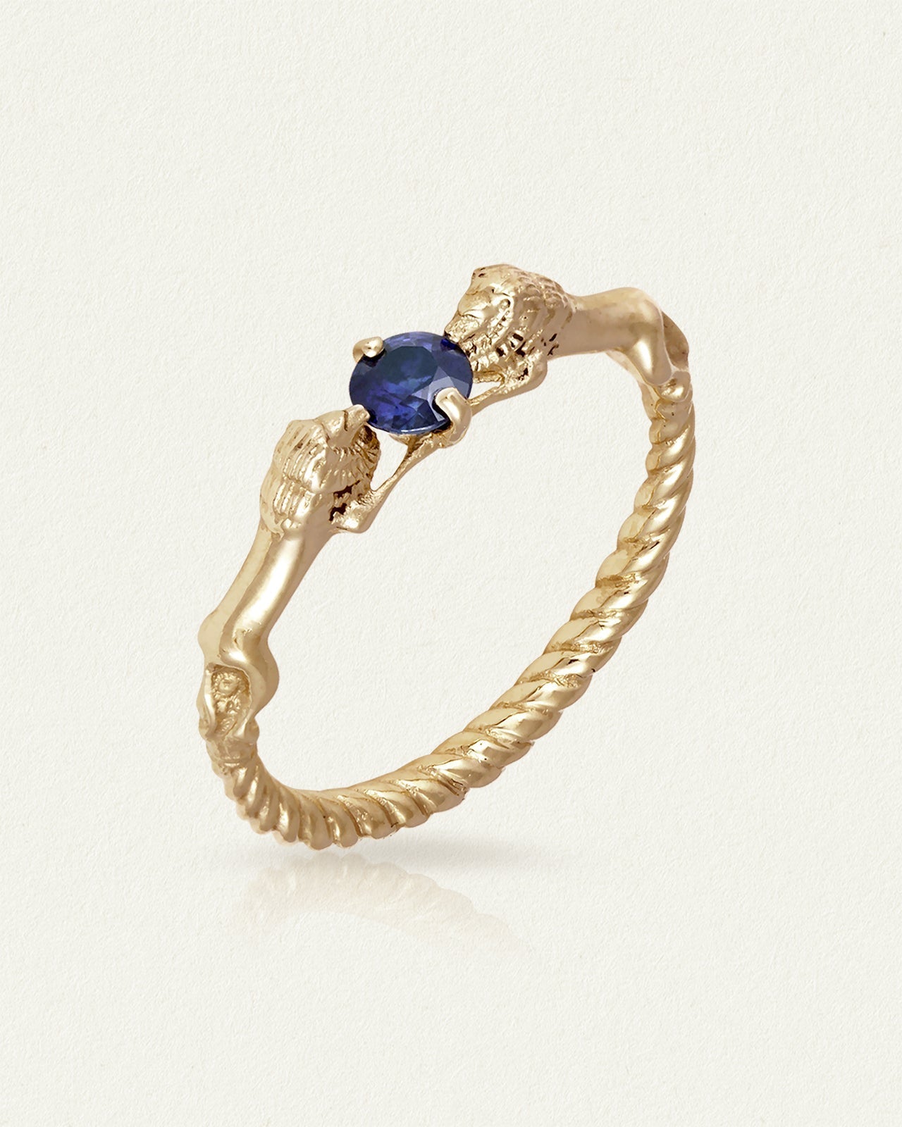 The Leon Ring in 9K & 14K Solid Gold is an intricately detailed piece, depicting two Lions rising from a spiralling band of solid gold, flanking a Blue Sapphire gemstone. A stone valued by the ancients as a symbol of insight, wisdom and power the Australian Blue Sapphire is a status symbol considered sacred across cultures throughout history.
