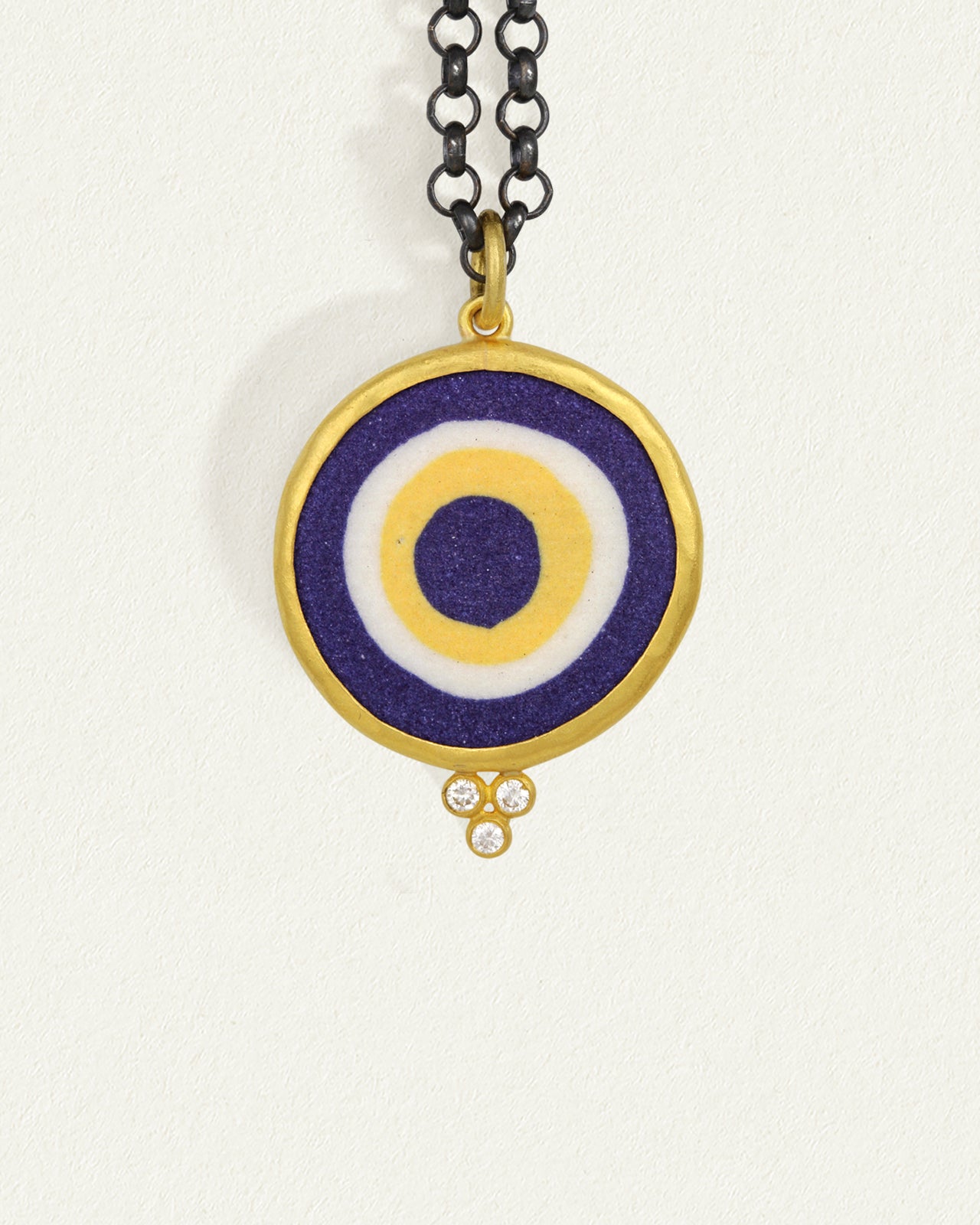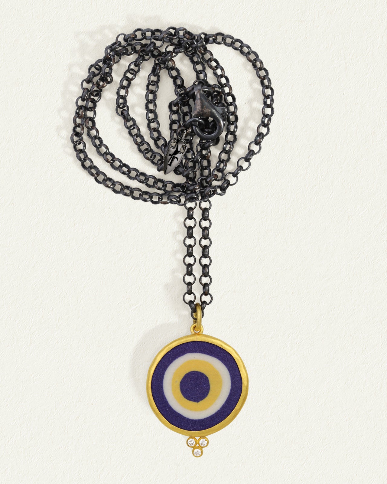 This pendant features an indigo ceramic mati encased in 24k yellow gold with a trio of natural diamonds. An oxidised sterling silver rollo chain completes this unisex necklace. The "Mati" or "Evil Eye" is a talisman with deep roots in Turkish culture, believed to ward off negative energy and protect the wearer from harm.