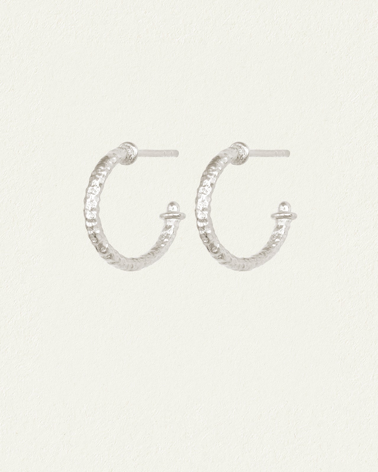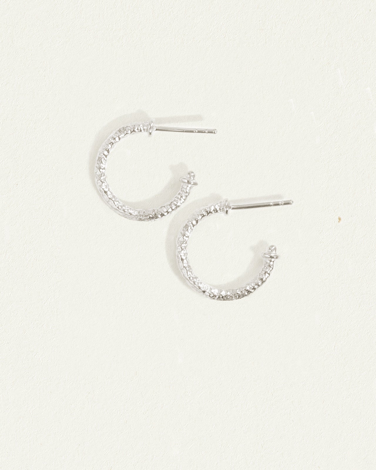 Formed of recycled sterling silver, these small hoop earrings are inspired by the raw power of molten earth. Their richly textured surface and compact size are perfect for adding depth to an ear stack.