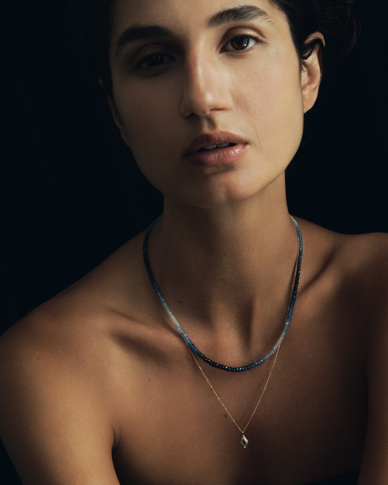 The Ombre Necklace in Sapphire is a playful expression of wisdom. A beaded necklace made of faceted sapphire beads, blending from light to dark in a cerulean ombre design. Since ancient times sapphires have been a status symbol, considered sacred across cultures throughout history, it's celestial blue mirroring the night sky, associating it with the heavens and the divine.