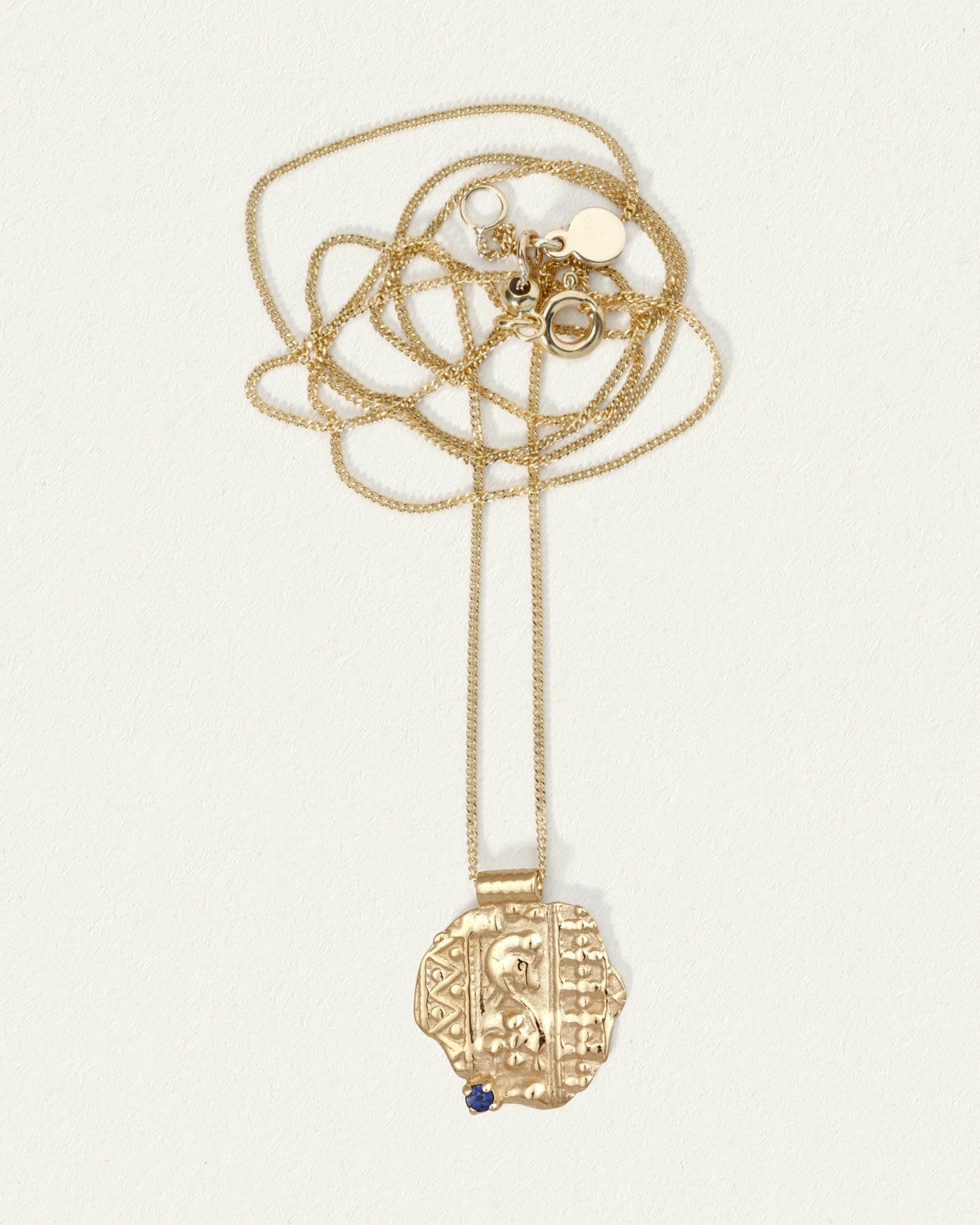 The Relic VIII Necklace features a pendant crafted from polished solid gold and suspended from a fine curb chain.