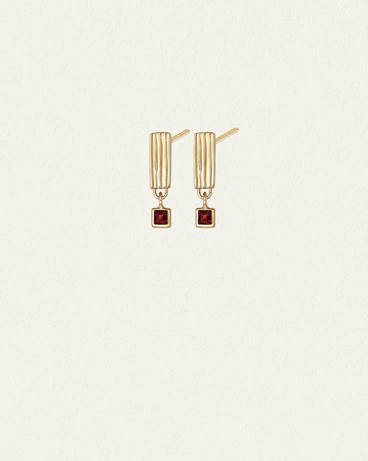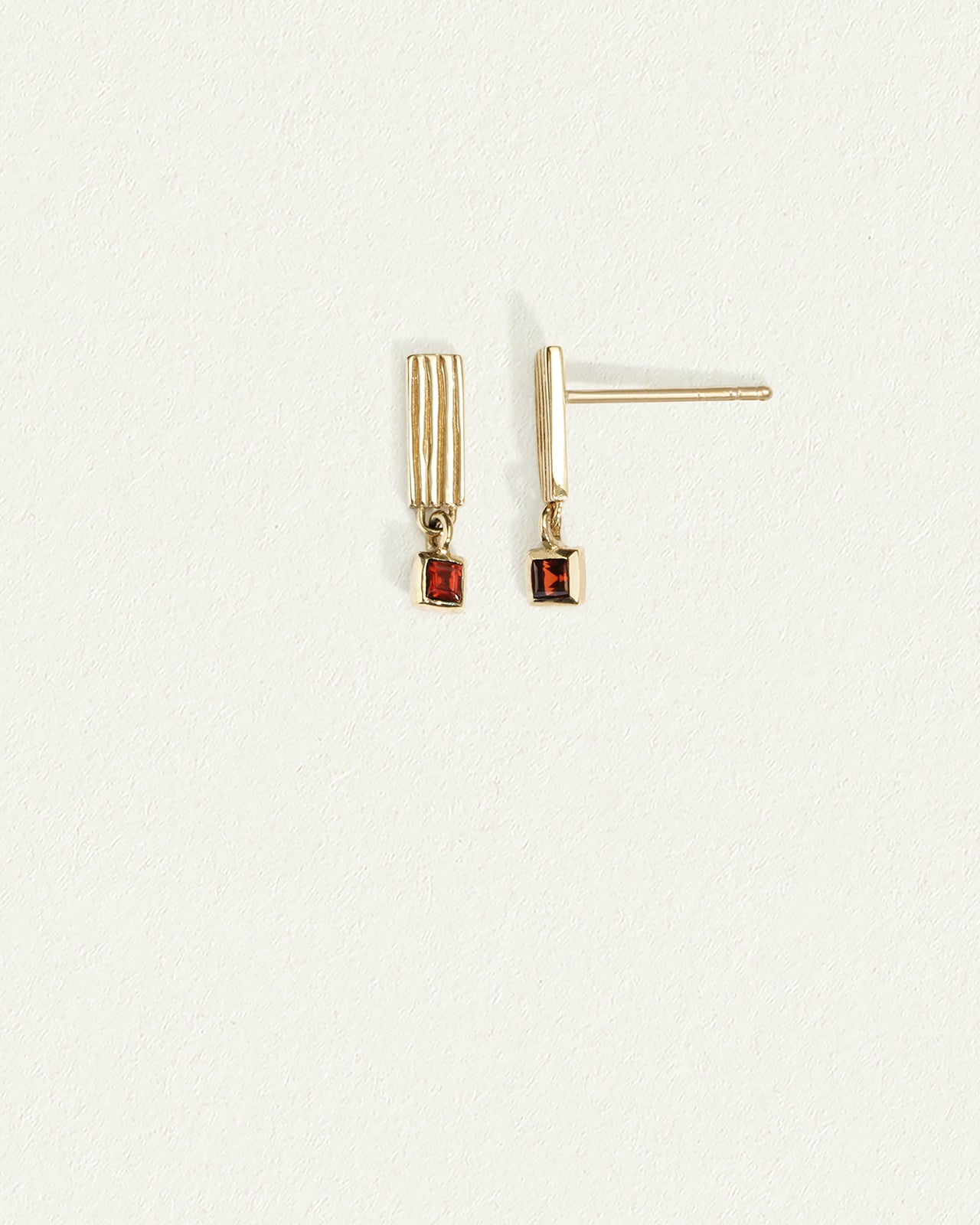 The Riva Earrings in 9K & 14K Solid Gold with Garnets are a stud earring with hand-carved, textural detailing. Delicate princess cut Garnets hang just below the lobe, their free movement reflecting and glittering in the light. Garnets carry the essence of primordial fire, stimulating creativity, energy, and sensuality.