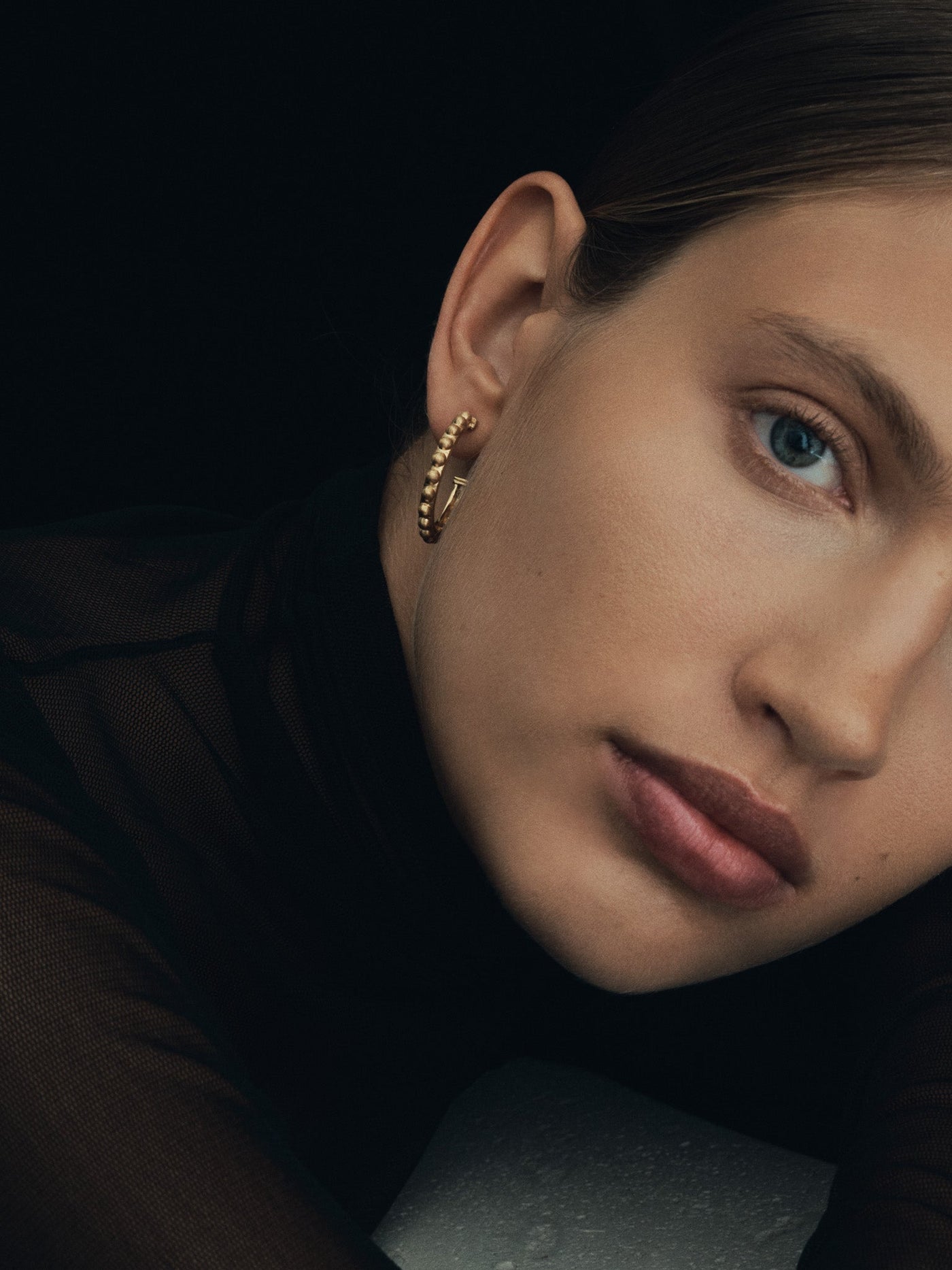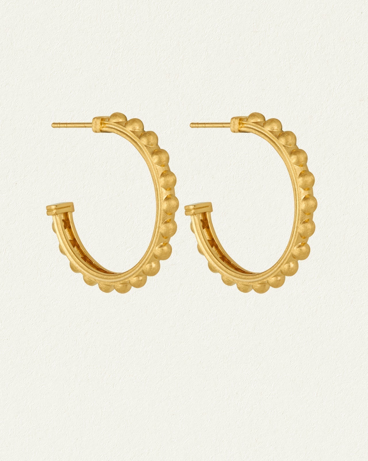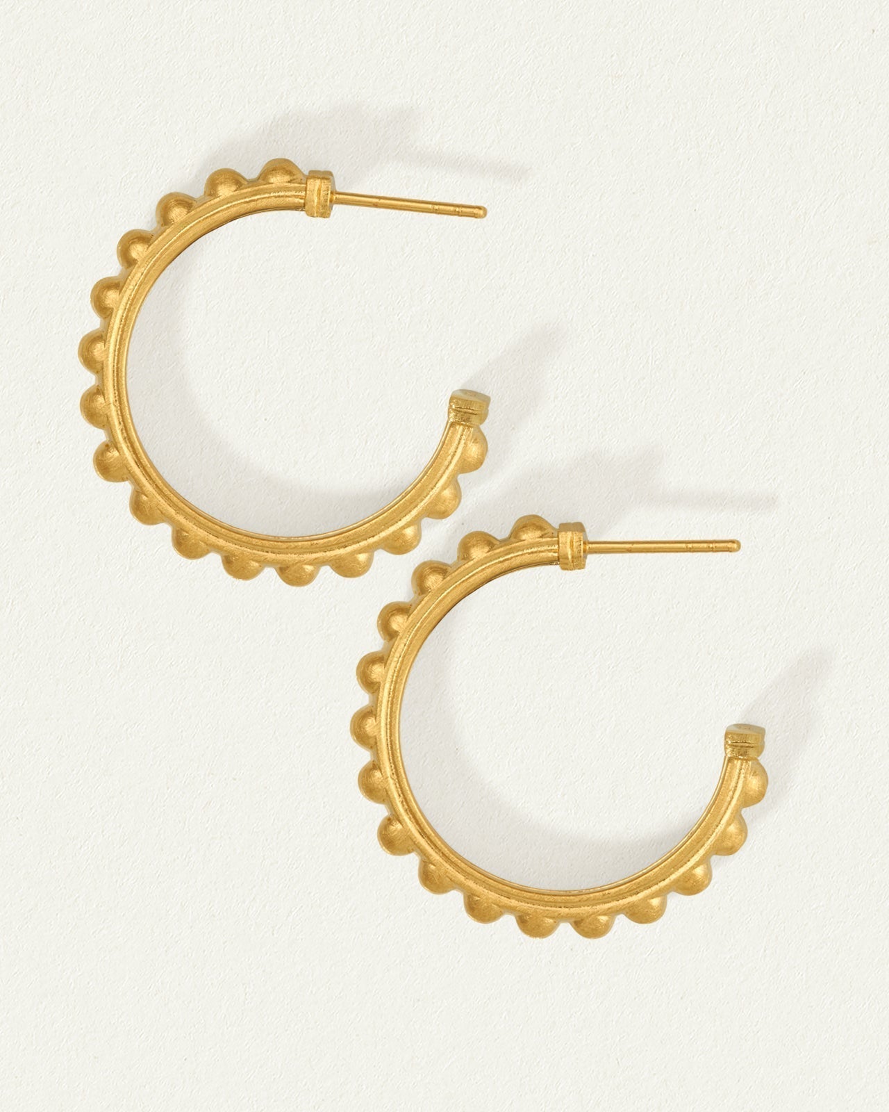 Inspired by ancient Roman jewellery, these softly brushed 18k gold vermeil hoop earrings feature a series of raised, rounded accents along their outer edges.