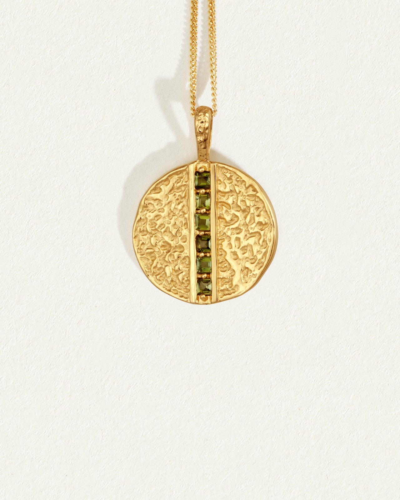 Inspired by the ascension of Semele, this 18k gold vermeil green tourmaline necklace represents growth and renewal. Suspended from a fine curb chain, the coin pendant captures the raw power of transformation in its intriguing molten texture.