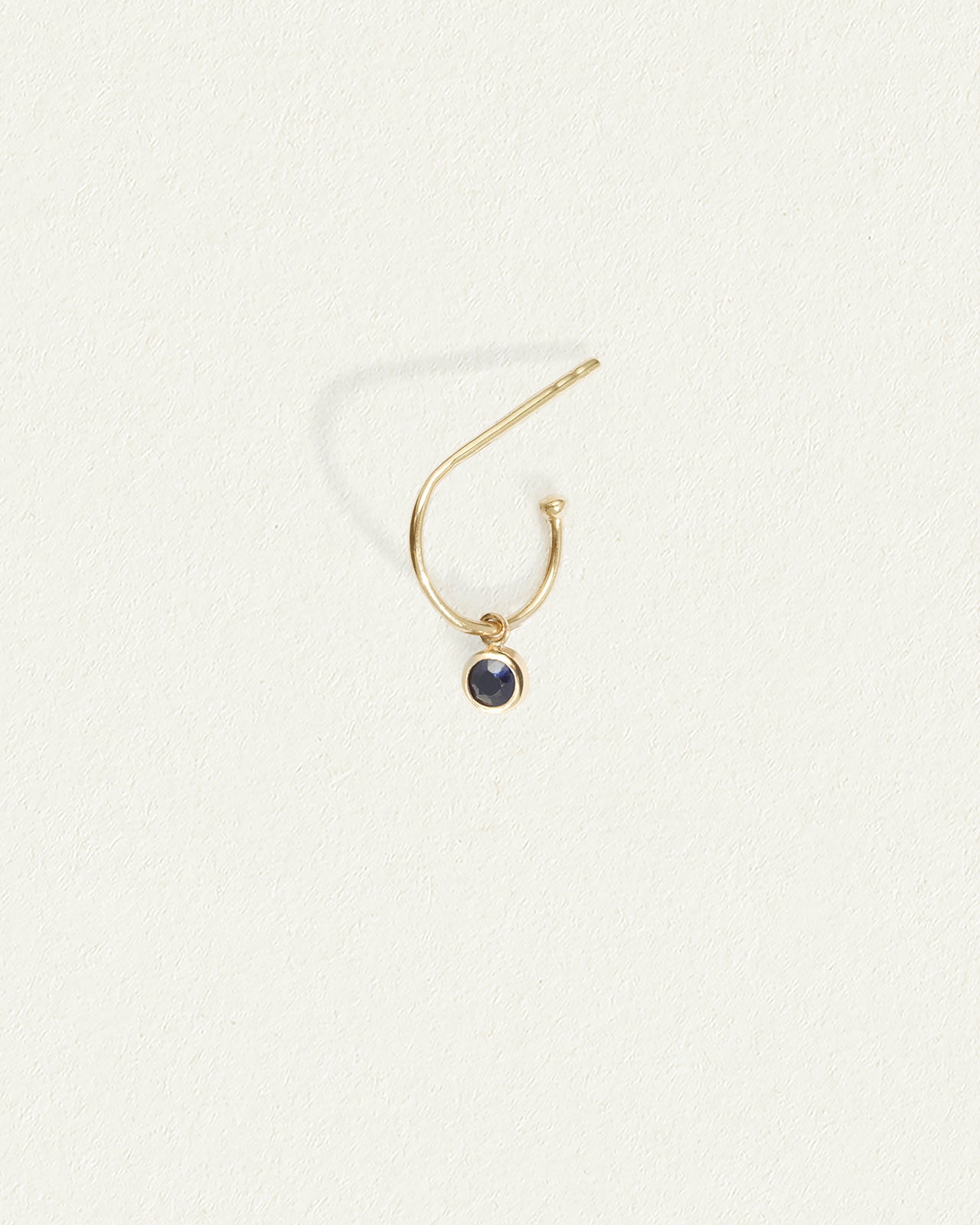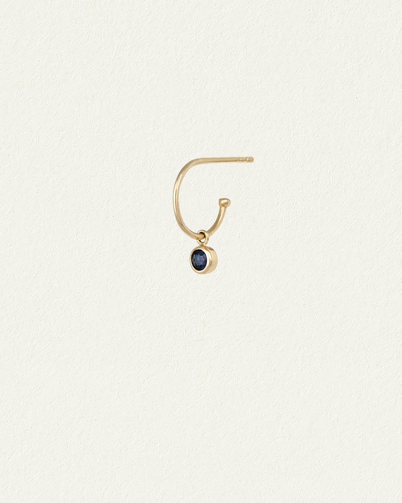 The Sollus Earring Sapphire is a delicate and minimalist design, perfect for stacking and layering. The single earring features a bezel-set round cut blue Sapphire suspended from a fine hoop earring, secured with a post and butterfly. An alchemical symbol for perfection, representing the eternal spiritual realm; the circle also signifies wholeness and natural completion.