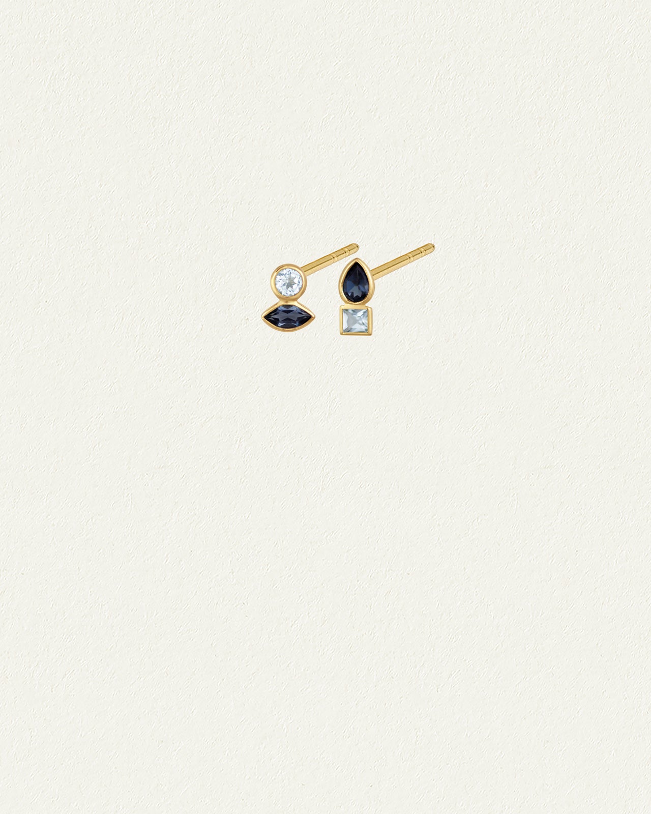 The Sulis Studs, in 18k gold vermeil, are asymmetrical stud earrings featuring shimmering shades of blue topaz that evoke the rejuvenating waters sacred to Sulis, Roman goddess of healing.