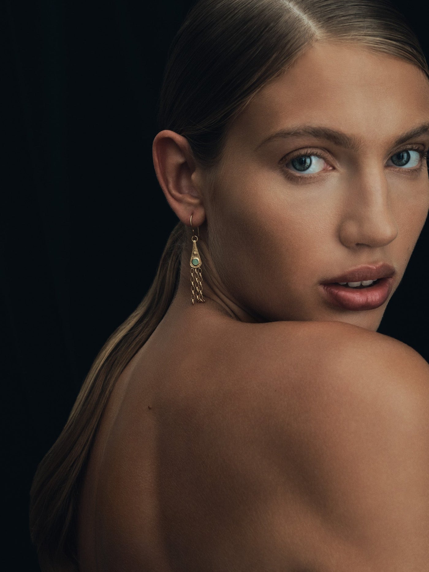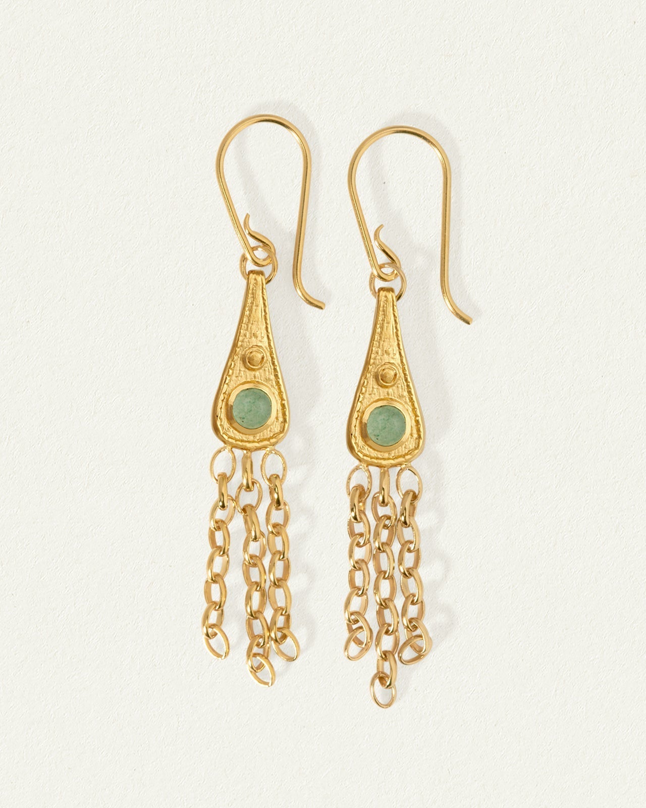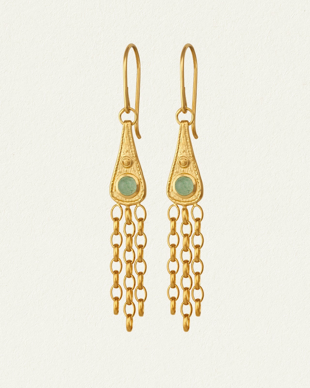 The Talis Earrings are 18k gold vermeil chandelier earrings set with green aventurine cabochons, a stone historically linked to good luck and prosperity.