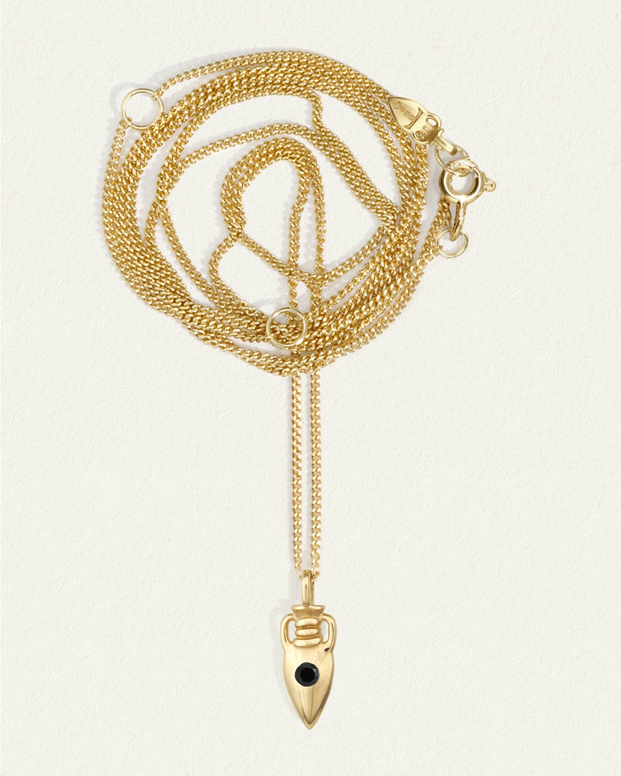 The Urn Necklace features a dainty yellow gold pendant in the form of an amphora, an ancient vessel associated with prosperity.