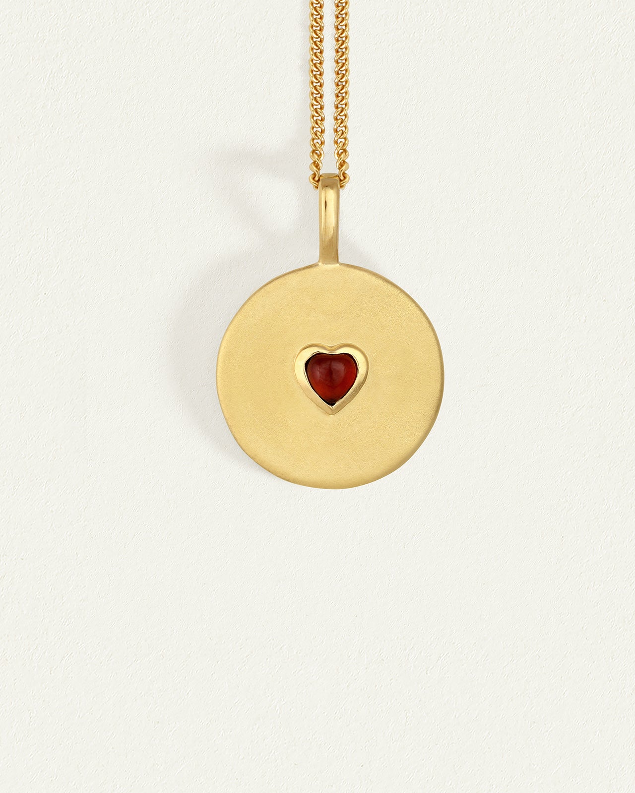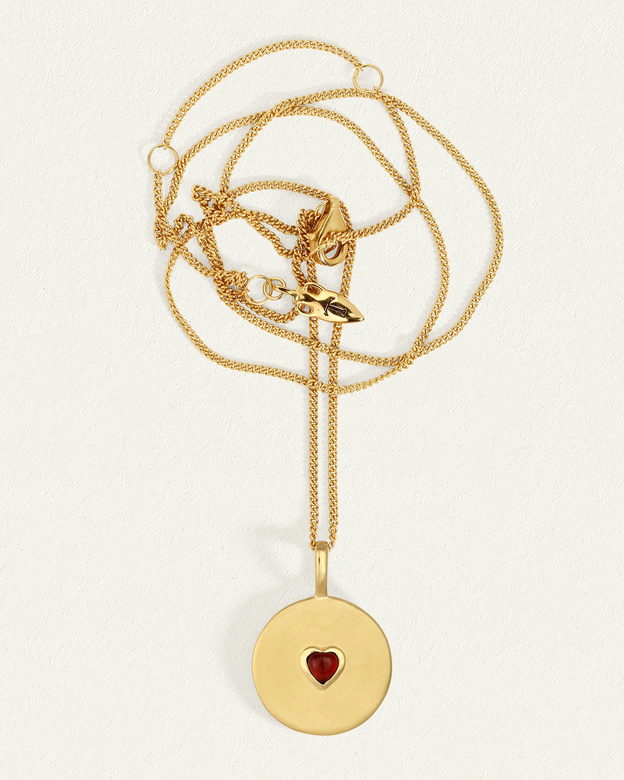 Crafted from 18k gold vermeil, the Venus Coin Necklace features a heart-shaped garnet set into a round pendant with a soft, silken sheen.