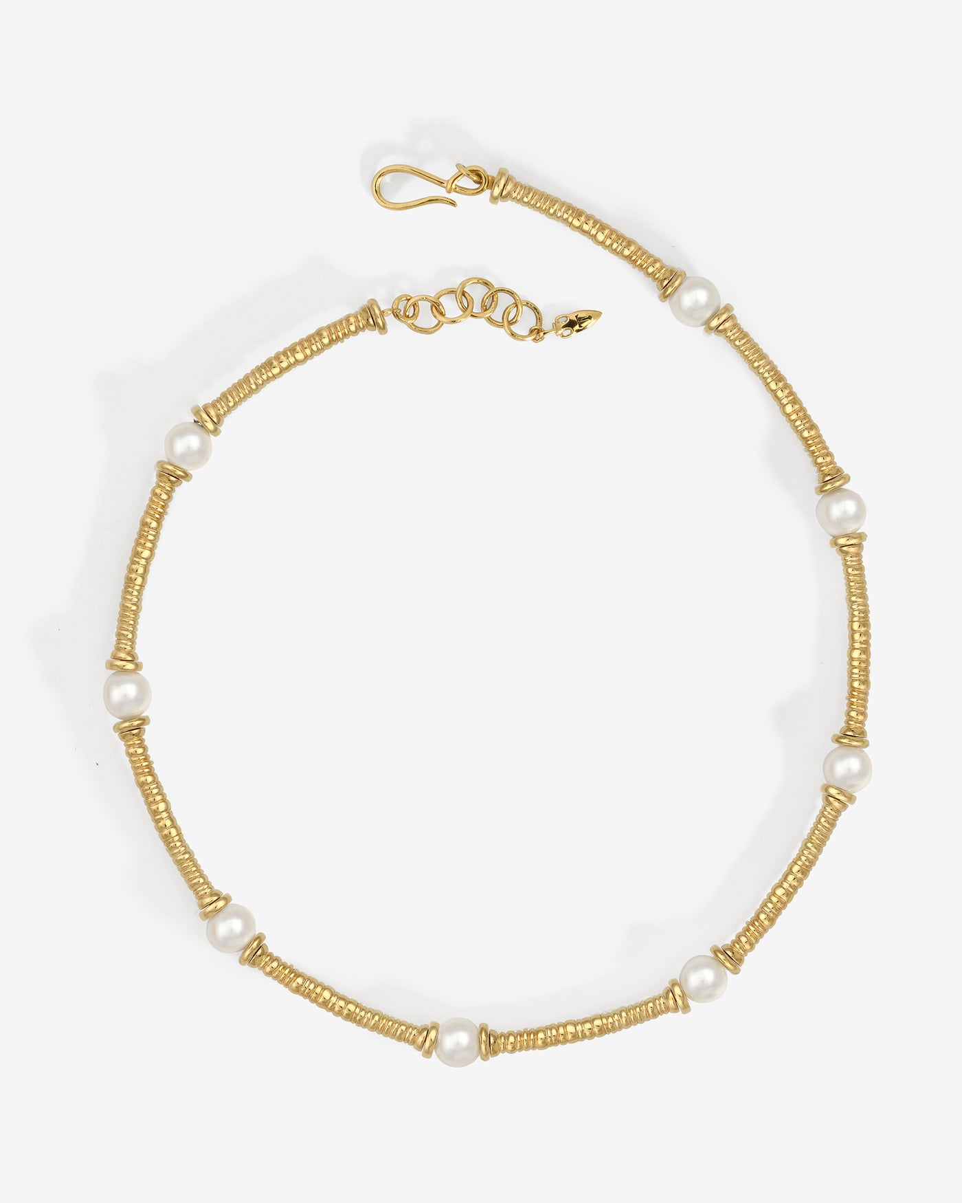The Olympia Necklace features 18k gold vermeil tube beads interspersed with freshwater pearls in a beaded station design.