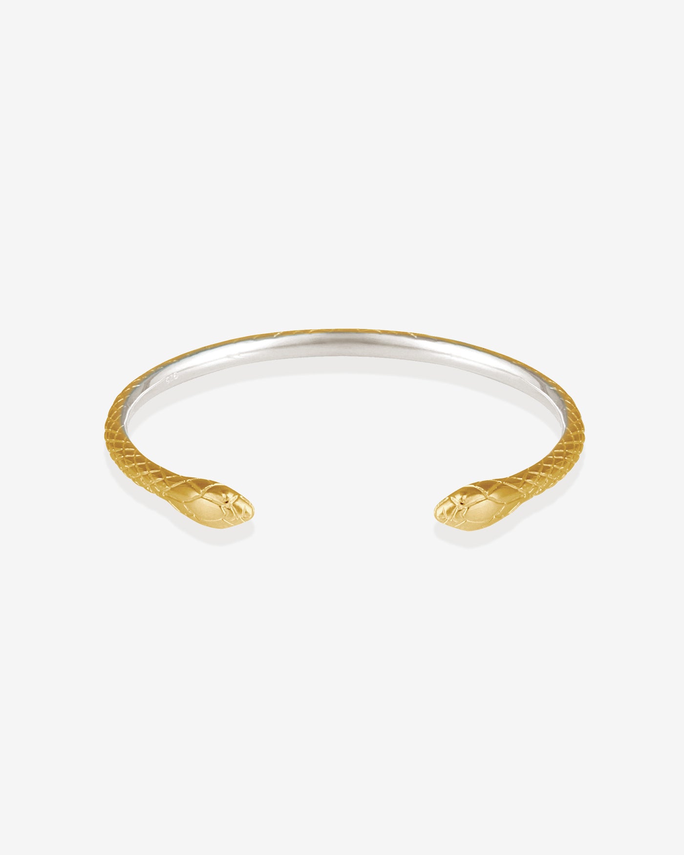 The serpent is one of the oldest and most widespread mythological symbols. Snakes are worshipped as guardians of the great goddess, mysteries of birth and regeneration. The Serpent Cuff is a double-headed serpent of polished 18K Gold Vermeil with a delicate underbelly of Ethical Sterling Silver. The serpent's heads meet eye to eye at the center of your wrist.